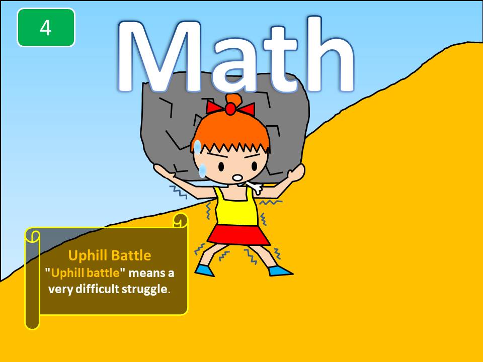 "Uphill"意指往上的斜坡。"Battle"就是一場爭鬥。因此"uphill battle"簡單來說就是一件非常困難的事情。當有一件事是非常難處理的時候,你可以說"It is an uphill battle to fight"。 Please check picture.1