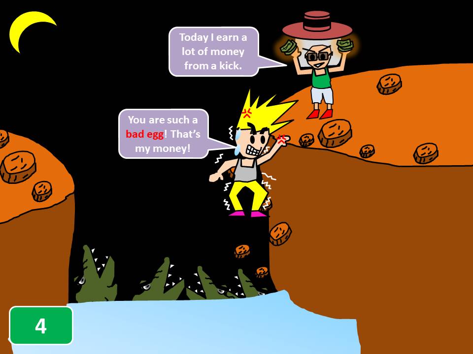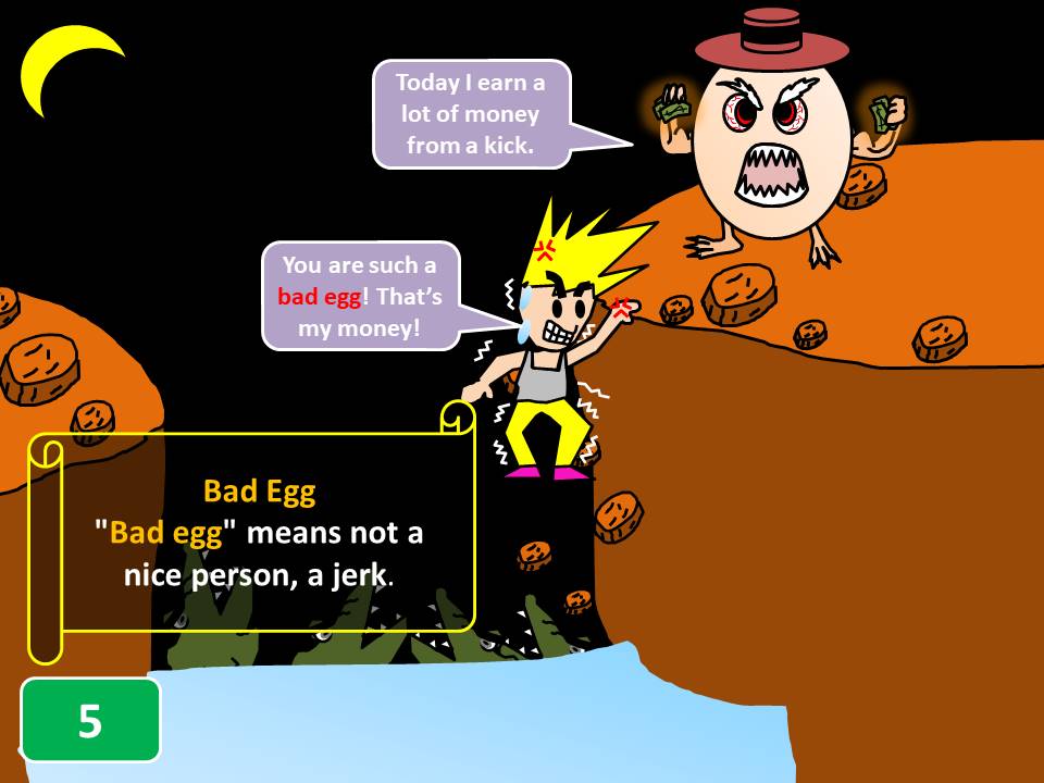 Let’s learn when to use "bad egg." When you see people being bad, dishonest, unreliable, or a good-for-nothing, you can call them "bad egg." Please check picture.1