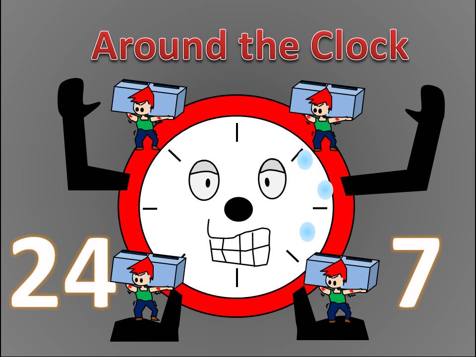 "Around the clock" means all day and all night. Doctors and nurses worked around the clock to help sick people feel better and allow them to recover well.