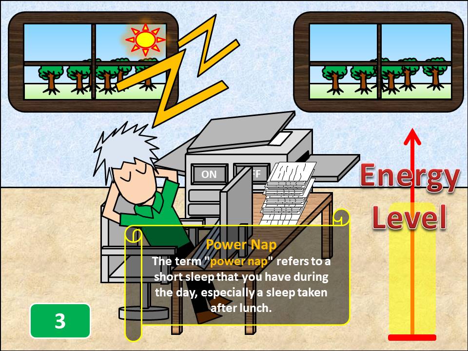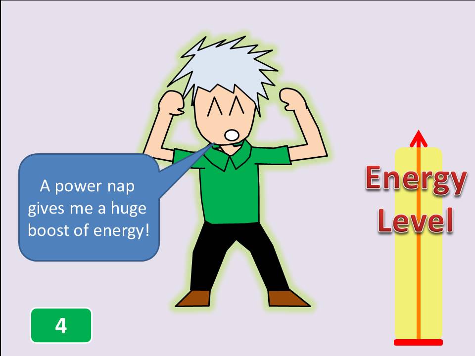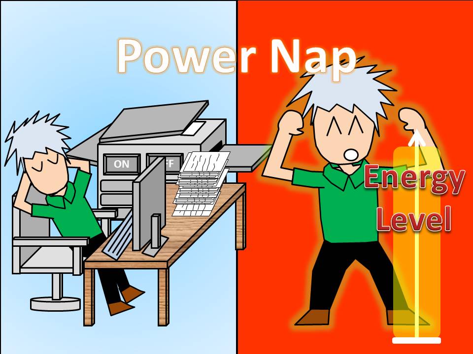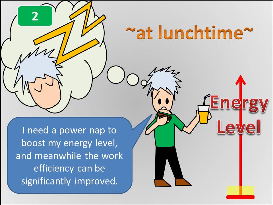 The word "nap" means a short sleep during a day, and "power nap" usually refers to a sleep taken after lunch. When we take a nap for about 15 to 20 minutes after lunch, we feel our energy level has been boosted. That’s why we call it a "power nap." picture.1