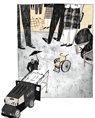 一個悶熱的下午,梅雨天氣,濕度重得黏人,地上還殘留著雨水的痕跡,照例又有一部救護車停在巷口,這回是深藍色的廂型車,後門已經敞開,車內留著長長的通道,是放擔架的地方,可是右手邊卻擺了一盆鮮花,旁邊還有幾串念珠,車上也沒有點滴架,讓人心裡一陣悸動,走到前頭一看,果然是一部像救護車的靈車,前座車窗旁,還擺了一塊壓克力板,白底墨字寫著「執行公務遺體清運中」,病人歸天了。