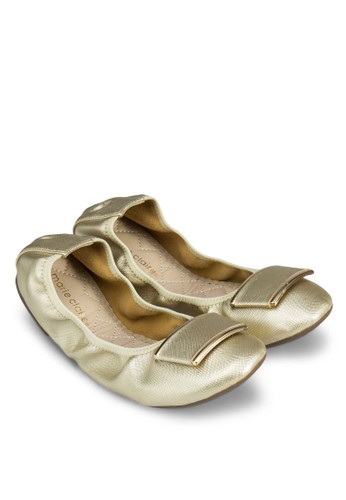 Marie Claire 的Genesis 金飾可折疊平底鞋,柔軟材質配以彈性鞋口,鞋頭有金屬裝飾,設計輕便時尚。 - 人造材質鞋面 - 圓形鞋頭 - 輕便穿套設計 - 金屬細節鞋頭設計 - 菱格紋縫線人造材質鞋墊,有品牌標誌細節 - 橡膠鞋底