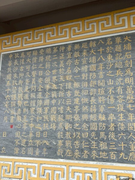 大埔石刻係岩盤碑文,與天后宮正殿媽祖墓碑一樣以石刻記載敘事平鋪地面,上覆透明罩覆蓋保護。岩盤碑文記載了明萬曆年間總兵沈有容於東莒不費一兵一卒捉拿69名倭寇功蹟,原來這69名倭寇因颱風漂流東莒無處可逃束手就擒,為紀念官兵保護海上漁民作業遂立石碑見證,碑文字跡出自工部侍郎董應舉。有趣的是島民相傳因日寇搶來寶物甚多沒法兒全帶走,故石刻本身為藏寶圖,倘能破解暗示即可於東莒島某處尋獲寶物。