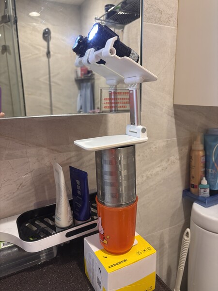 實務操作:想像一下人站立有高度,如何解決「電筒架在與面部」同樣高度方便探照口內的難題呢?墨嘗試數回,想出以電蚊香空盒為底座,架了二只漱口杯,再上疊摺疊手機架,再架好電筒搞定(如圖示):