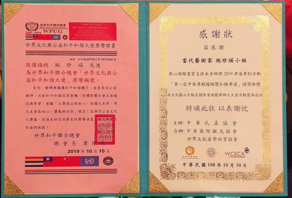 本會常務理事施珍瑛獲頒《世界和平大使》證書。