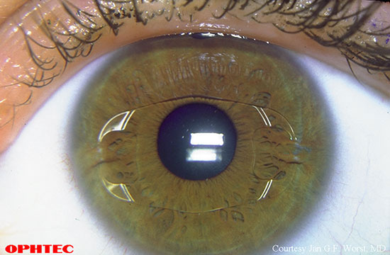 ‧虹膜固定式植入鏡片使用微型隱形眼鏡,是依據個人所需矯正的度數,利用精密電腦的計算,量身訂做適合的植入式鏡片,因為該鏡片會被固定於虹膜上,就像是在眼睛裡戴上隱形眼鏡,患者就可以擁有清晰的視力了。
