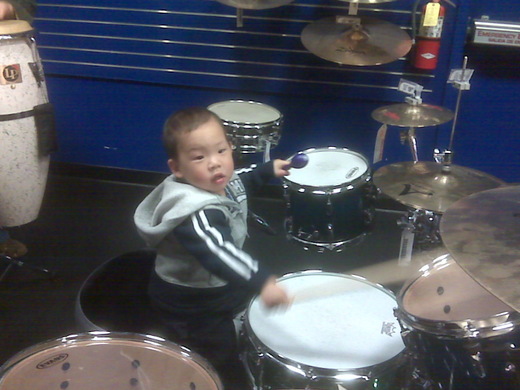 昨天和外公講電話,他還自己唱一段不知名的歌-兩隻貓咪,聽起來像是綜合他會唱的歌。不過他現在越來越有自己的意見,之前他還會任你點歌,現在點歌他還會說"不要!要兩隻老虎!"目前的自定曲不外乎是"兩隻老虎"或是"一閃一閃亮晶晶"再不然是"泥娃娃"這孩子似乎對音樂有股天生的興趣,上週六全家去樂器行選購爸爸的吉他,這人東敲敲西打打的彷彿是自家的店,到了鼓區簡直樂翻了,夏威夷鼓打完又拿著鼓棒在每個鈸上都敲一遍,我只好緊張兮兮緊跟著他怕他砸了什麼東西,後來爸爸選好過來找我們,忍不住技癢敲打了一番,這小子竟然跟著鼓點跳起了像是踏步的舞來,爸爸見狀把他抱上了椅子,結果他還頗有大將之風的打了幾下,那模樣真是可愛,我趕緊拿了手機幫他照了幾張,最樂的其實是他爸爸,因為覺得這兒子有他的真傳,後來這小子一直緊抓著鼓棒不放,那鼓棒也只好跟著我們回家了。一路上,都可明顯感覺安安的興奮,感覺似乎和鼓有種相見恨晚的感覺。我開始想以後要是他想買鼓該如何拒絕,立刻決定就用婆婆當初回答安安爸爸的經典名言:"鼓或你,只能有一個住在家裡!"真是佩服婆婆的英明睿智呀!