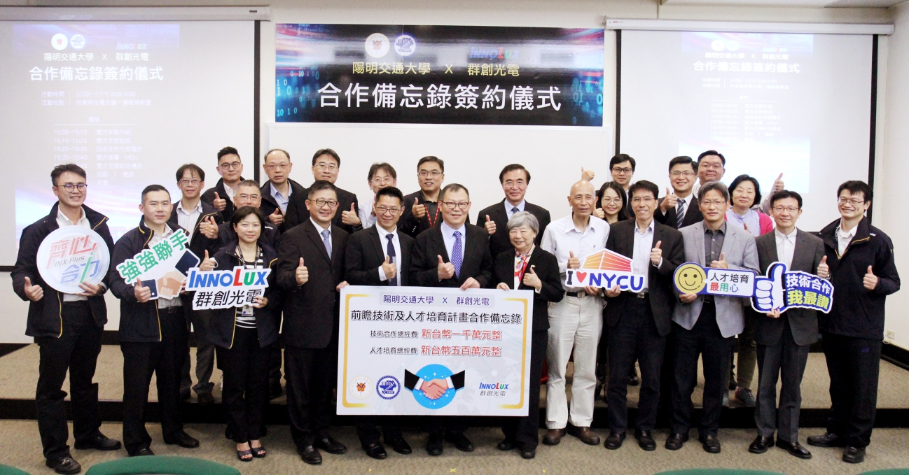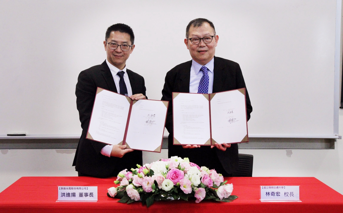 為強化光電關鍵技術研發能量,國立陽明交通大學今(3/29)日與群創光電於光復校區田家炳光電中心大樓簽訂合作備忘錄,由陽明交大校長林奇宏與群創董事長暨執行長洪進揚共同主持,擘畫產學合作研發新動能,開啟前瞻顯示技術新紀元。