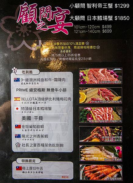 5.顧問之宴,大顧問1850元:必點澳洲和牛與鱈場蟹;小顧問1299元:必點智利帝王蟹