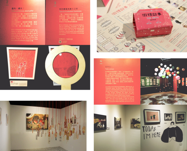 原本還有點擔心展覽跟網路上的報導不同,整個展場內所設計的許多巧思,讓觀賞者同時成為參與者的角色,趣味性十足。如Doris Fable以懸空紅線掛上已編號的小卡片,與民眾抽獎贈禮互動;低級失誤將主旨隱藏於畫作之中,拿起紅色濾鏡才能看透;還有摸摸傑夫在開幕當天與觀眾互動的即時畫作等。徵禮啟事展場邊備有「禮良卡好」、「穴穴你」、「敲喜翻」等創意印章供壓印收藏,且展覽簡介本身就是可以折疊的小巧禮物盒,親手摺製完成就是傳遞幸福的另一個禮物。