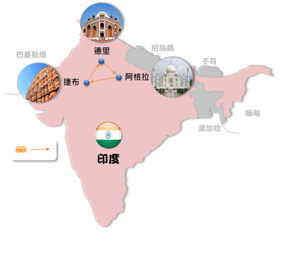 (圖一)印度半島全徒與金三角-德里、捷布與阿格拉位置圖