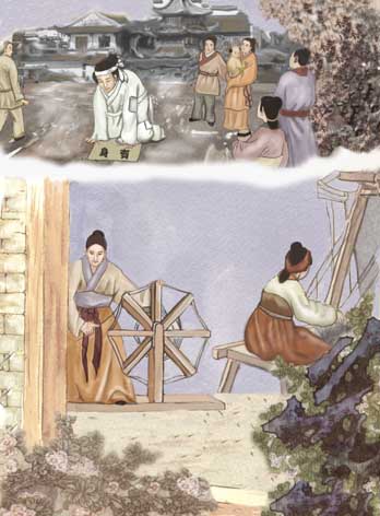 就一同到債主家裡去做工。債主嚴苛地命他要織好三百匹的紗羅布料,