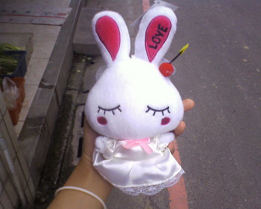 然而,我吊重了一隻娃娃,滿大隻的!是一隻穿著新娘衣服的兔子,