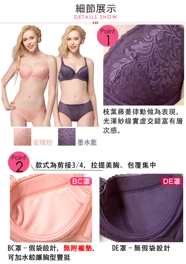2. 3/4罩剪接款,罩杯─滿版花板與邊框條搭配表現