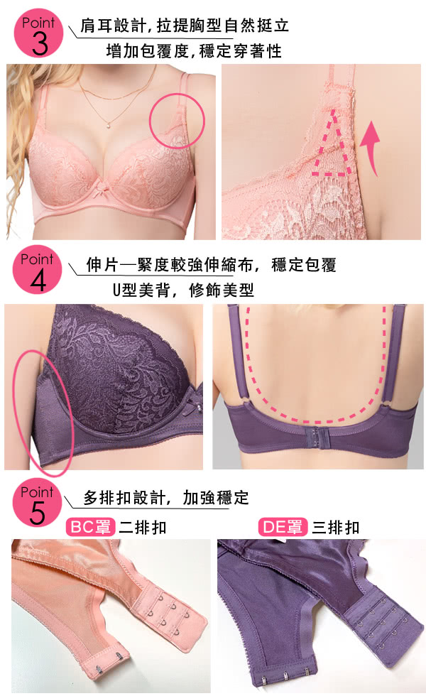 7. 背鉤─BC罩:二排,DE罩:三排,穿著更加穩定。