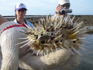 水漸漸越來越深,淹到腳踝的時候有好多小螃蟹,滑溜的青苔的附近凹穴都是小螃蟹,海葵優遊自在的假裝自己是植物,輕輕一碰就全縮回去,真的很害羞。海葵的觸手擁有斑斕的紋路,紅色、咖啡色間雜,縮小時只有一根灰色的小管子,實在很可愛!但是,再怎麼樣也敵不過最可愛的巨星,正當我們輕輕抓著又長又黑的海參,感受牠從緊繃逐漸變軟,猛然向我們噴水時──腳下游過一個奇怪的東西,肉肉肥肥的搖著身體向前游動,速度怎麼這麼慢呢?有人伸手碰了碰,那個東西竟然開始減速躲避──彷彿被魔法點到似的,突然膨脹成一顆白白的、圓滾滾的球!