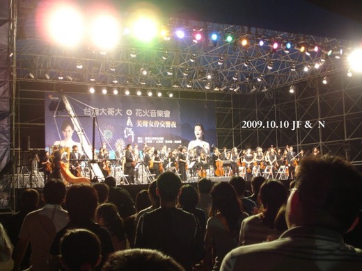 當夜微雨,椅子早就排好了(免費入場),還有絡繹不絕的人們,紛紛搬橘色塑膠高腳椅隨地擺,盡是等待的興奮之情。女高音黃絢雯唱莫札特魔迪中的《地獄之火燃燒我心》,網路上看她以前的演出,當時的交響樂團太糟糕,比起日月潭現場聽來,歌聲同樣動人,而且交響樂團強多了。詹怡嘉歌聲渾厚,我喜歡她唱歌時渾然天成的霸氣,那是經過練習與淬煉後的篤定,一曲Ah! Je veux vivre*(《我願活在夢中》選自羅密歐與茱麗葉)驚豔全場。最好聽的當然是安可曲Time to Say Goodbye*,高音真的非常好聽,尤其愛詹怡嘉的段落,音色低沉圓亮,咬字的特殊趣味更是無窮,是整場表演中最好的。