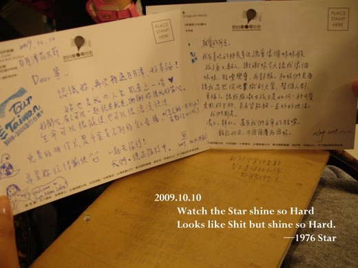 「和妳見面讓我忽然從地獄到天堂,整個人都幸福了。讓我感激女孩子是如何一種可愛柔軟的生物。真希望能夠一直好好地活。我們都是。濃山。靜水。還有我們安寧的聒噪。銘記此日,不因國慶而因妳。 Ning2009.10.10」