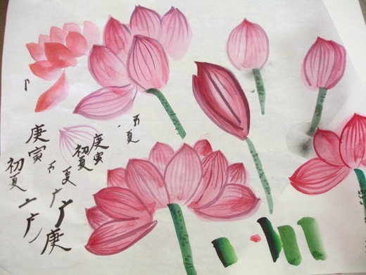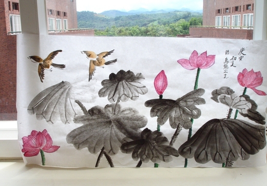 同學抽出袋子裡的水墨畫,攤開來,遠山近景和米氏雲山盡現眼前。大家讚嘆又羨慕 。 加選課程日最後一天才選到,漏了第一堂課,同學說要帶:「毛筆墨水墊布宣紙透明水彩調色盤……」天啊!筆墨紙硯四大咖都快到齊了,我幹麻選這個自找麻煩呢?