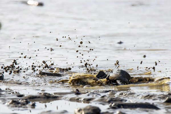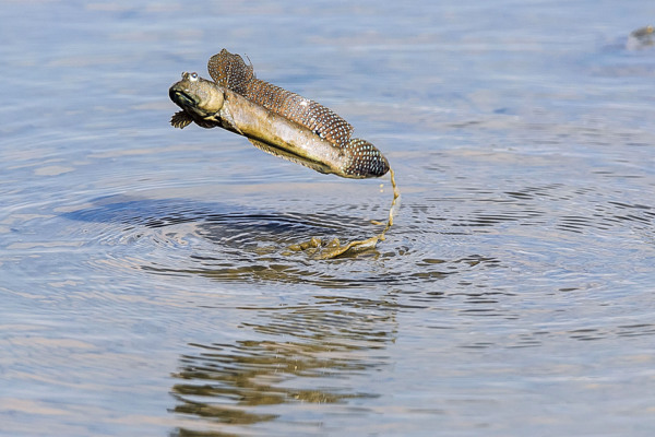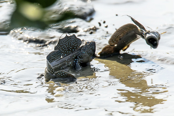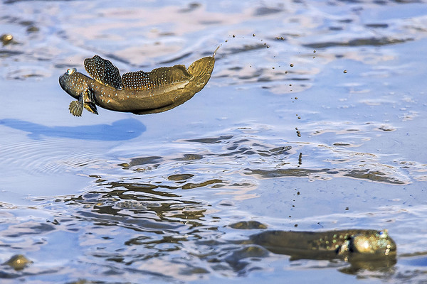彈塗魚又名花跳、跳跳魚,屬於兩棲的魚類,棲息於河口的泥灘地,雄魚成熟後習慣在雌魚面前跳求偶舞,