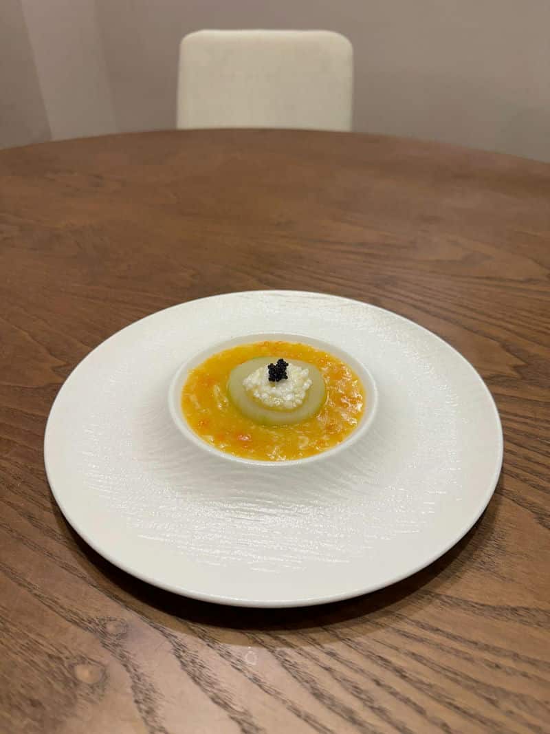 當天晚上,我們被引導到一個完全獨立的包廂,一進去我就鬆了一大口氣。那空間的設計很有質感,燈光柔和,音樂輕緩,完全聽不到外面的一點聲響,真的做到了極致的隱密性。整個氛圍都讓人覺得放鬆又浪漫,我知道這裡絕對不會有被其他客人打擾的風險。每一道上來的菜餚都像藝術品一樣,從開胃菜到主餐,甚至是甜點,擺盤都美到讓人捨不得吃,而且味道更是沒話說,是真正媲美Fine Dining水準的精緻料理。我女朋友一邊品嚐一邊驚呼連連,臉上的笑容根本藏不住。