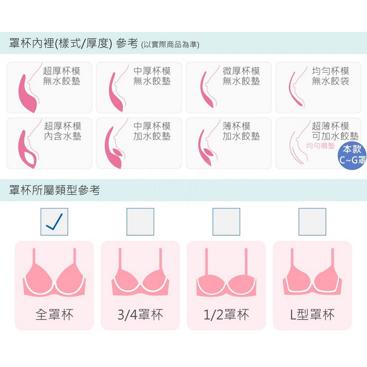 罩杯分為:全罩杯、3/4杯、1/2杯。
