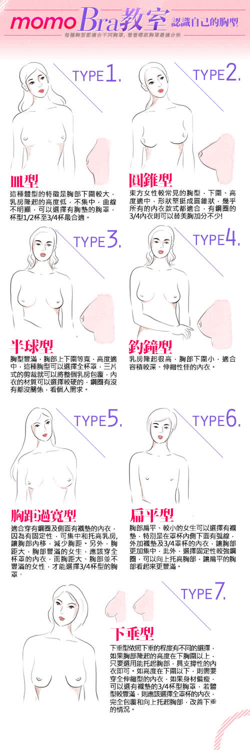 1,胸部扁平,外溢,擴散類的胸型選內衣時要選擇集中型的內衣,也就是選擇3/4罩杯的內衣,這樣能夠更好地襯托出胸部挺拔的胸線。【蓓氏嘉】MIT軟鋼圈 圓滿胸罩 B-C(紫)