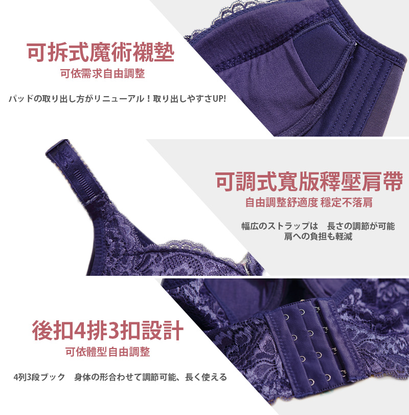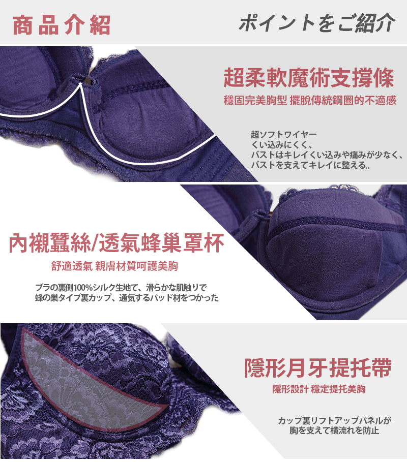 月牙提托帶隱藏於蕾絲之下,在穿著時會有感包覆集中,並穩定胸型不外擴。