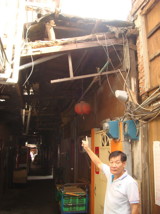 前陣子「梅姬」颱風的豪雨就壓垮了老舊的房子,黃金財說,10月20日清晨五點臨江街108-19號房舍老舊頂棚,在捱了40多年的風雨後,終於頂不住垮了下來,市政府難道要等出了人命才願處理,他說,早就向建管處通報了三次,就是沒來處理。