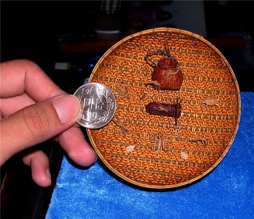 「蔑絲密編水族世界」以1個直徑不到10公分的迷你竹盤為襯底,編織放上迷你魚簍、蝦子、螃蟹、魚及烏龜,其中,小蝦子幾乎跟米粒一般大,