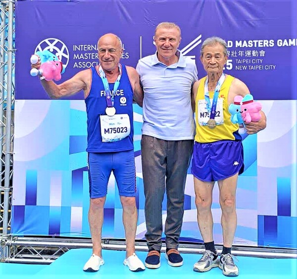 圖說:世壯運75+撐竿跳鄭清榮(右)贏了法國老選手,接受昔日世界撐竿跳紀錄保持者「飛鳥」布卡親掛上金牌並合影。