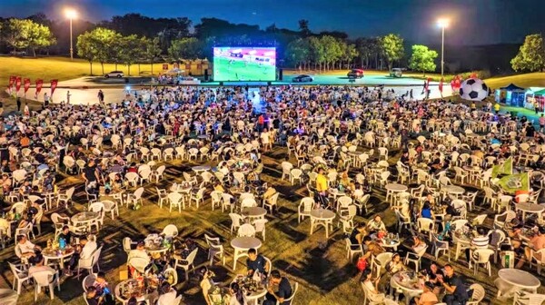 當然,從「觀影」到「觀賽」,一字之差,也能折射出社會需求的深刻變遷。昔日的露天電影大多是單向的文化供給,今日的露天足球觀影則是全民參與的互動狂歡。譬如江蘇園博園的創意活動,在架設賽事直播屏的同時,還配套「全民K歌互動區」、無人機焰火秀、生態草坪露營區,同時策劃「蘇超風味」主題市集,匯聚50餘家特色攤位。傳統露天廣場的單一功能,被解構重組為「視聽+味覺+體驗」的複合型消費場景,市民觀賽也升級為「體育+生態+藝術」的複合體驗。