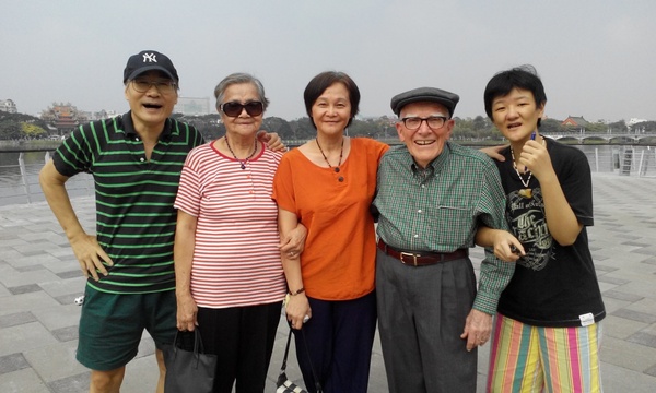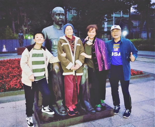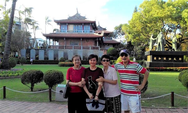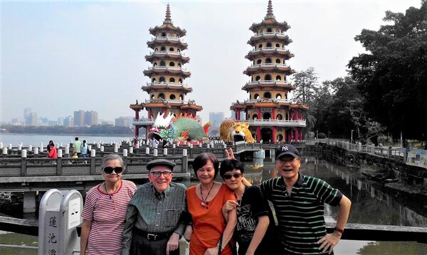 2015年老岳母與我們陪同侯牧師在高雄蓮池潭塔前留影。