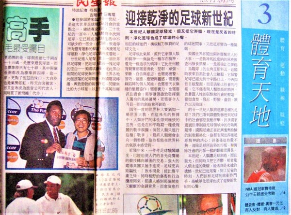 世界盃創賽近百年來最傳奇的球王當然是「黑珍珠」比利,法國世界盃前一年,1997年六月比利以MasterCard世界足球巡迴大使身分也曾抵台,隨後,轉赴吉隆坡主持「世界足球展望會」,發哥獲邀出席盛會,在民生報作專題報導,落幕會上,發哥把球王在台北時我寫比利上民生報頭版報紙親自送他,更留下發哥與球王難得的合影,成了一生珍藏(見首圖)。