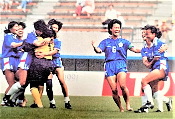 1991年中華木蘭在亞洲賽PK擊敗北韓闖進世界盃一刻,全隊衝入場擁抱擋下PK的門將洪麗琴。(取自何長發照片) 相關連結樂聯網全文分享請點入:https://leho.com.tw/archives/2...
