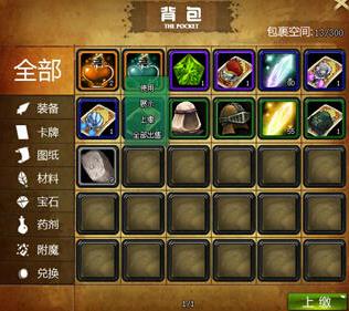 背包裡可以儲存裝備、卡牌、圖紙、材料、寶石、藥劑、附魔、兌換。