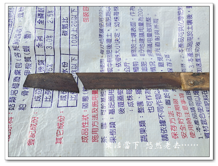 在鋸破布仔樹時一不小心使力不當將鋸子弄斷,心裡很懊悔不小心造成的失誤,也很不捨鋸子斷了,雖然是一把老掉牙的鋸子,但老鋸子很耐用,即使鈍了用銼刀磨一磨就鋒利如新,又可以再用很久,不像現在的鋸子,鋸沒二下就鈍,鈍了就要換鋸片。幸好只斷了尾端一小節,勉強還可以繼續用。不過也因為這把老鋸子的鋸齒太小,鋸樹木的速度慢,又另行購買了一把鋸齒較大的鋸子。
