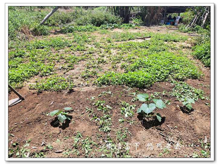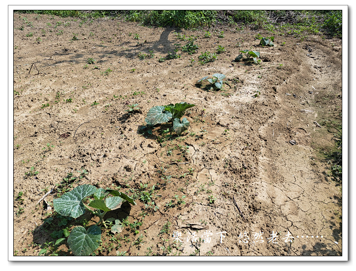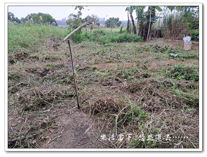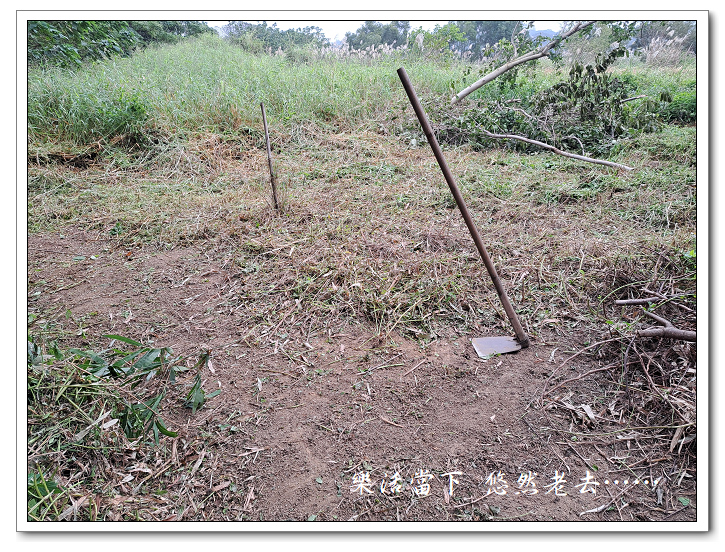 草除下後還是留在原地,打算就地曬乾再來移除,曬乾後移除時草的重量就會輕許多,移除草時比較輕鬆,同時若是接下來連續都是晴天,有草隔離太陽,土表不會被曬得太乾而變硬難鬆土。近處立在地面的小竹竿是去年立的,去年常有鄰居借由此過去河邊開或關水閘門,擔心南瓜小苗被踩踏,因而在小苗旁立了一根竹竿做提醒。