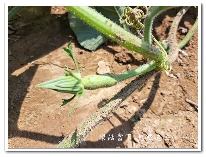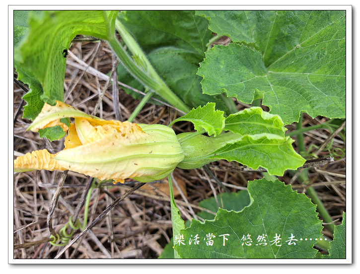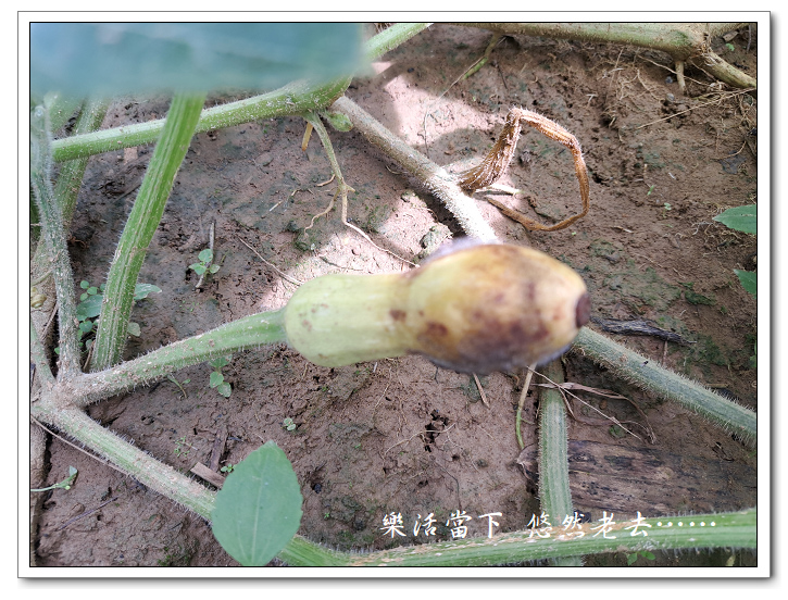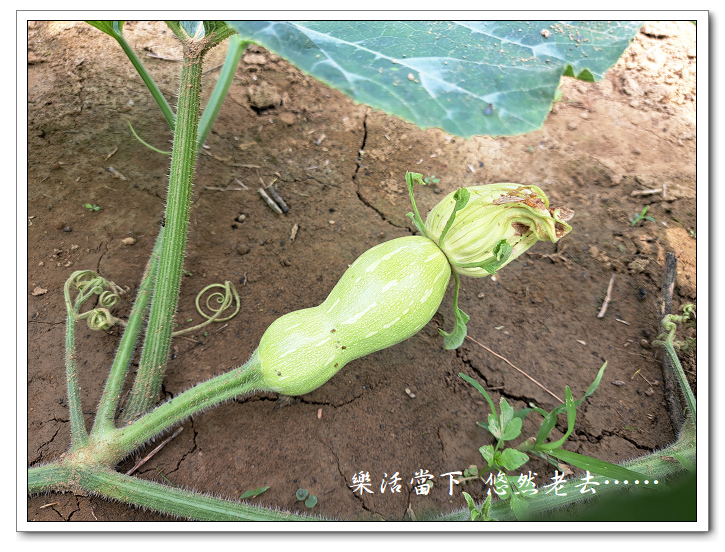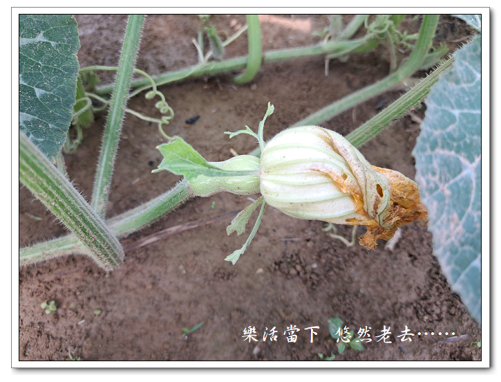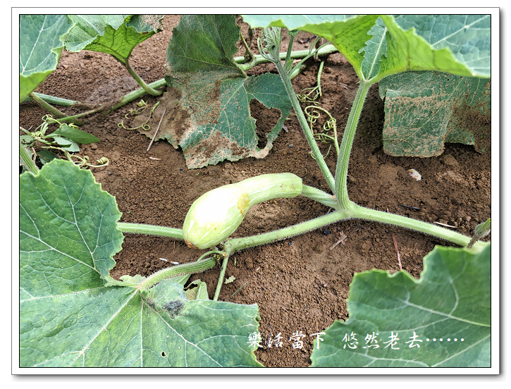 最後種的二株南瓜,幾次開花後可能都沒能授粉成功而凋謝,有二顆授粉成功結果後卻被果實蠅叮咬而落果,到了今天總算看到一顆結果了,但現在藤蔓和葉子都不多,這顆南瓜能不能長大成熟實在是難以預料,不抱太大希望就不會失望,一切順其自然。