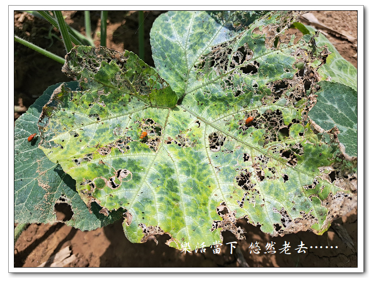 部份的葉子被黃守瓜啃食嚴重,再啃食下去將會變成一張只有留下葉脈的網子,但不噴灑農藥就只能睜一隻眼閉一隻眼任它去吧,現在葉子多比較不在乎。