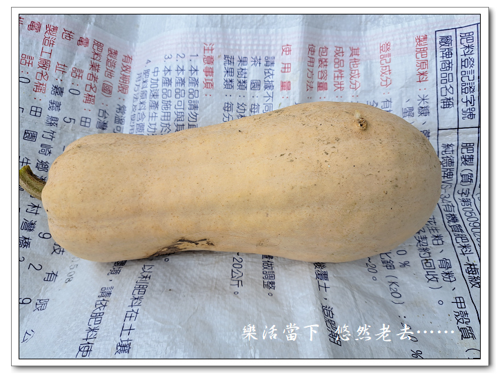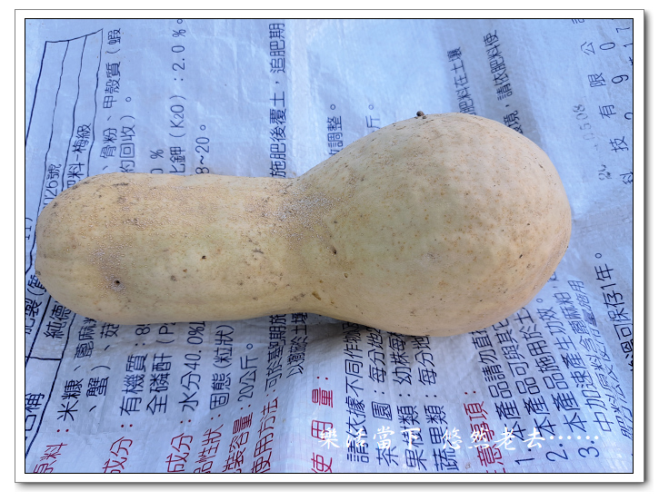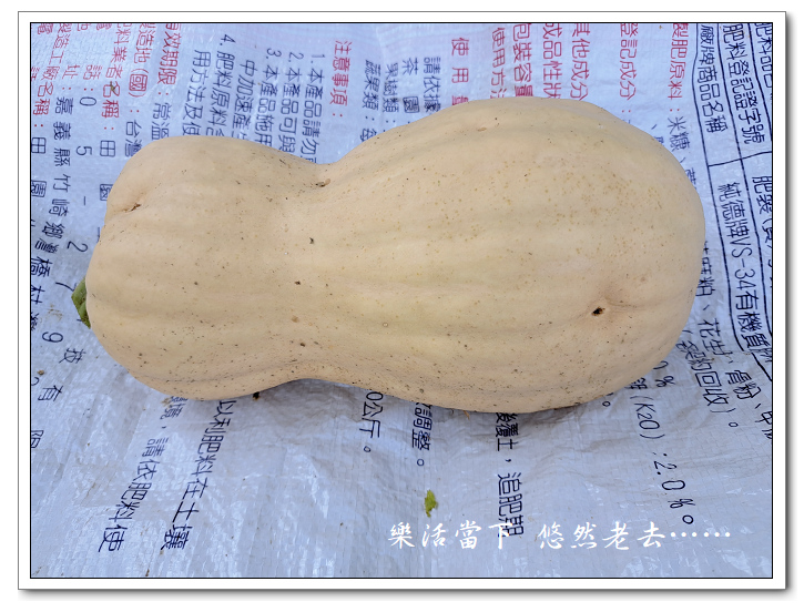 一顆體型不大的南瓜,看它的果梗已有木質化的顏色,但摘下後才發現果梗只有單面變色,其它面表現並不夠成熟,應該再留在藤上幾天後再摘更好。這顆比起之前摘的都小,重量只有約1.8公斤。