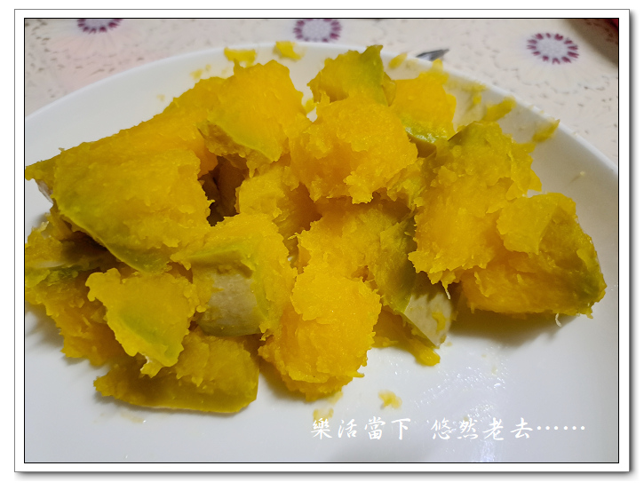 將南瓜煮來吃吃看,綿密口感有但略嫌不足,甜度也差了那麼一點,所以是摘了太早了些,畢竟由開花到摘下來的時間還不到一個月,若是留在藤上讓它更成熟些,口感必然會更好。
