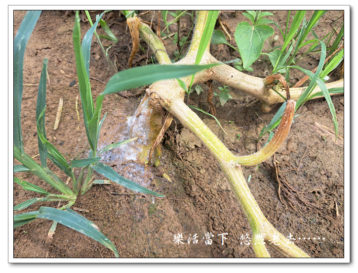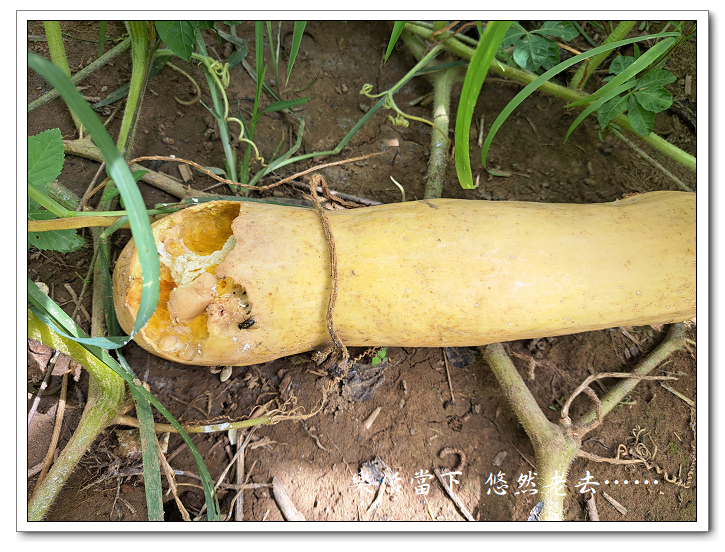每次摘南瓜時都會大致的將未摘南瓜檢查有沒有異狀,二天前還完好,二天後卻有一顆嚴重裂開,鼠害之外又損失了一顆。