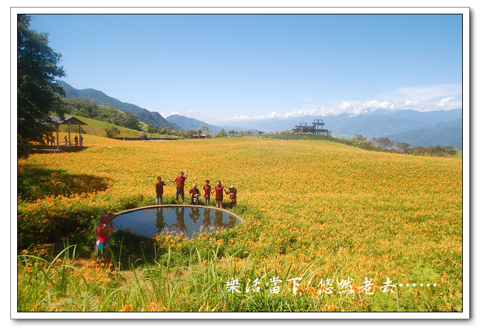 辦法總是人想出來的,他們退下水池邊,改站到金針花旁,這麼一來就可以跳了。
