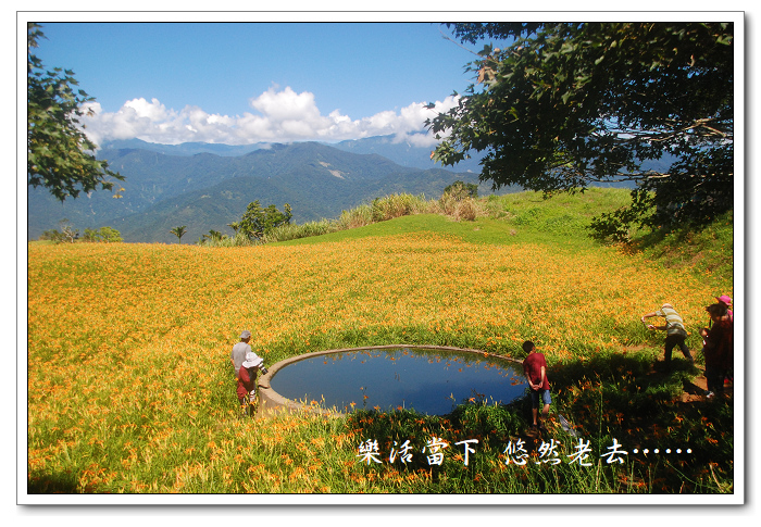 依農業課人員說的,這是第三處背風面的金針花,也就等於是今年六十石山上的最後一處沒被颱風摧殘的金針花。圓形水池剛好有一群人站在池邊上拍照,掌鏡的人發出號令「跳」,水池的邊不寬,大概只有腳掌的寬度或略小而已,如果是你,你敢跳嗎?所以只聽到一陣歡笑聲,但不見跳的動作。