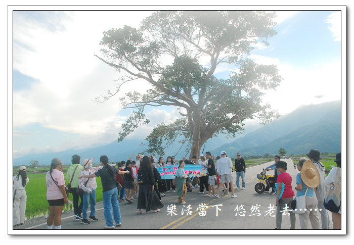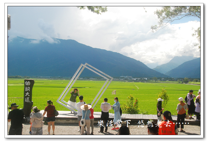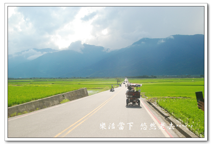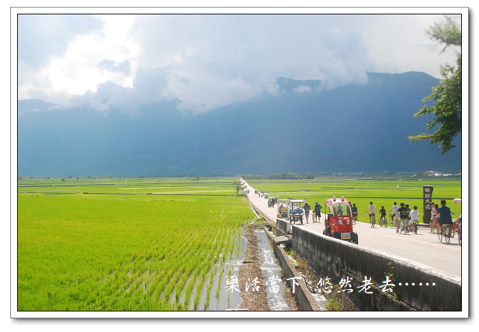 伯朗大道筆直往前延伸,兩側寬廣的稻田雖不是秋收的金黃色,黃綠色的小水稻倒也頗為好看。只是大片烏雲籠罩在天空,沒有藍天白雲的精彩,又令人擔心是否會下起午後雷陣雨。