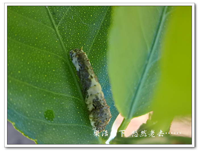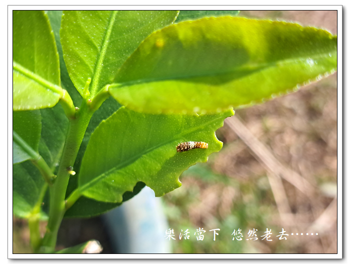 將檸檬換盆後隨即看到鳳蝶在葉子上做出產卵的動作,過沒幾天就看到檸檬葉子被啃食的痕跡,此時鳳蝶幼蟲雖然還小,但已經很容易就可以看到牠的存在。