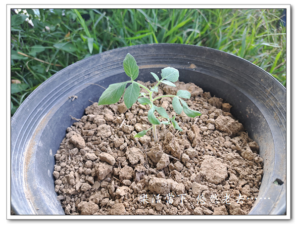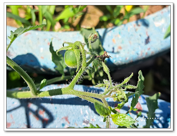 九月中友人給了一株番茄苗,北部地區雨水多,所以將小苗安置在一個花盆中,以利於小苗成長期間的搬移,離開時就將小番茄移入遮雨棚下躲雨,避免因下大雨而造成小苗死亡。