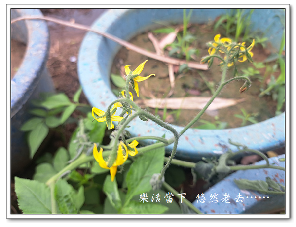北部地區連下了十天的雨,而且雨下得很大,十天後再看到番茄已經是奄奄一息,軟趴趴的臥倒在旁邊的盆子上,葉子幾乎全枯萎,只剩下最頂端的幾朵金黃色花還閃亮亮的,估計與這株番茄緣份大概就此結束,所以也不再去動它,不論生或死都是命。