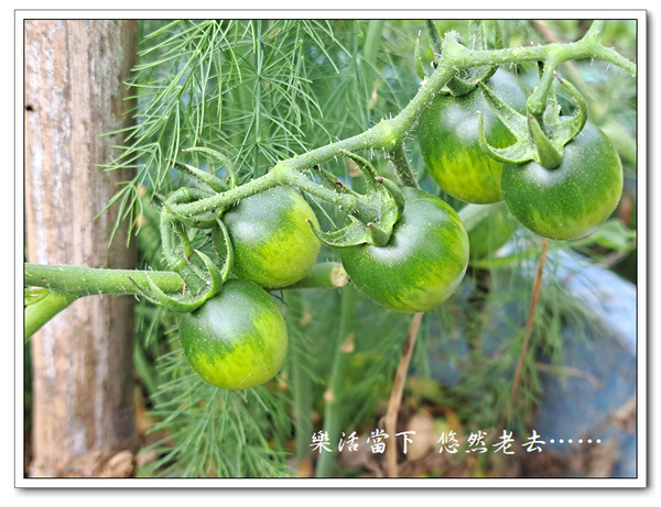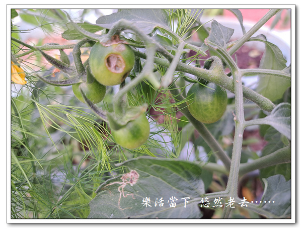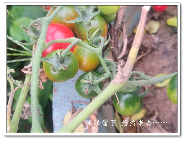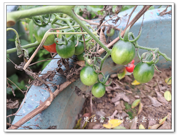 經過了之前無法澆水的摧殘,番茄部份的枝條枯乾,而存活的枝條繼續結果,看了令人感動。
